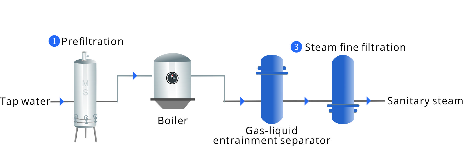 Membrane Solutions recommendations for the filtration and applications of the main sites in the production process of sanitary grade steam filtration are as follows: