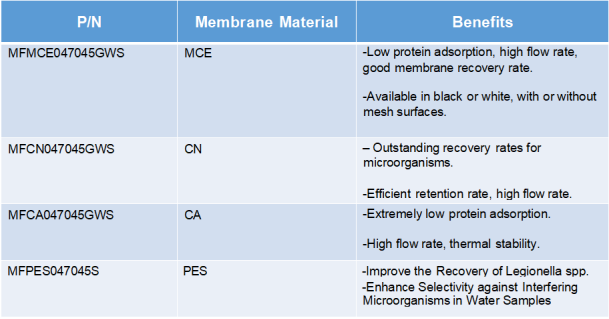 MCE membranes is a mixture of cellulose nitrate and cellulose acetate which allows effective retention with high-flow rates and optimal colony growth.