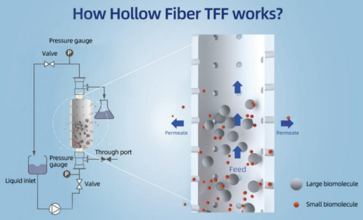 Tangential Flow Filtration (TFF): In hollow fiber systems, the tangential flow (feed flowing parallel to the membrane) helps reduce the buildup of particles and solutes on the membrane surface, a phenomenon called fouling. This reduces the likelihood of clogging, maintaining high filtration efficiency over time.