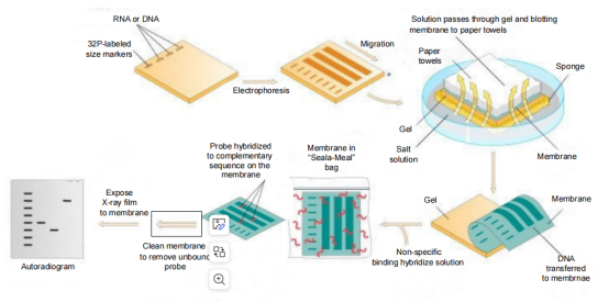 Southern Blotting:The principle of Southern Blotting is based on the base-pair complementarity of DNA double-strands. If complementary sequences exist between the DNA single-strands of two organisms, DNA double-stranded can form. If one DNA single-strands is labeled with a probe, the another DNA single-strands which is the target DNA can also been labeled to detection and analysis. Similar to Western Blotting,Southern DNA fragments are first separated using gel electrophoresis according to their sizes.What is different is that the DNA should undergo the denaturation, from DNA double-strands into DNA single-strands,then transferred onto a solid support. Non-specific binding sites on the membrane are blocked using a pre-hybridization solution. The single-stranded DNA labeled with probes is hybridized with the target DNA on the membrane,then excess hybridization solution is washed off and the hybridized DNA is detected and analyzed through colorimetric or other visualization methods. The entire experimental procedures includes DNA preparation, electrophoresis separation, membrane transfer, pre-hybridization, hybridization, washing, signal development, and imaging analysis.The detail flow diagram shows in figure2.