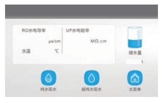 - Feed water, R0 reverse osmosis water, DI deionized water/UP ultrapure water 3-way water quality real-time monitoring, you can check the water quality without taking water.