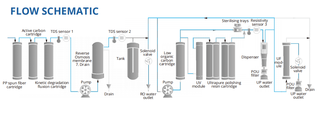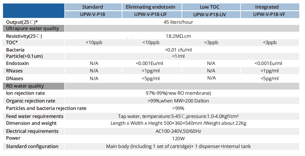 The resistivity of ultrapure water reaches 18.2MΩ.cm, which fully complies with the Class I water quality standards formulated by GB/T 6682-2008, GB/T33087-2016, ASTM, CAP, CLSI, EP and USP.