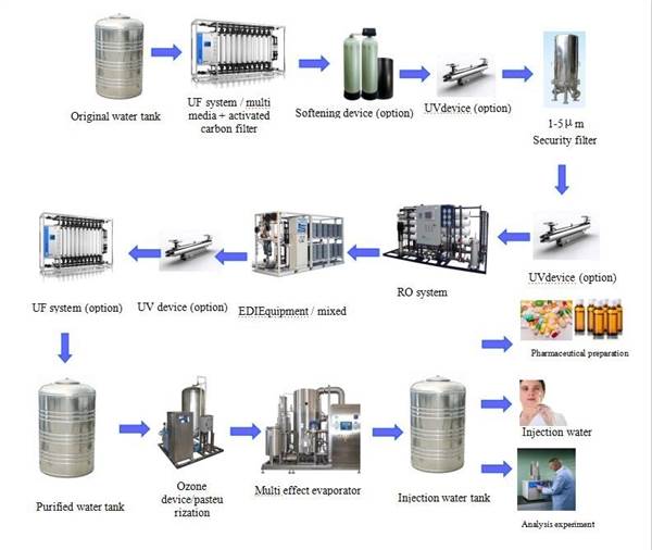 Ultra Pure Water System for pharmaceutical mainly consists of three systems: before treatment and membrane treatment & Electric in salt (mixed bed) and water for injection (WFI) treatment, the effluent quality is equal to or more than 18M Omega.cm.